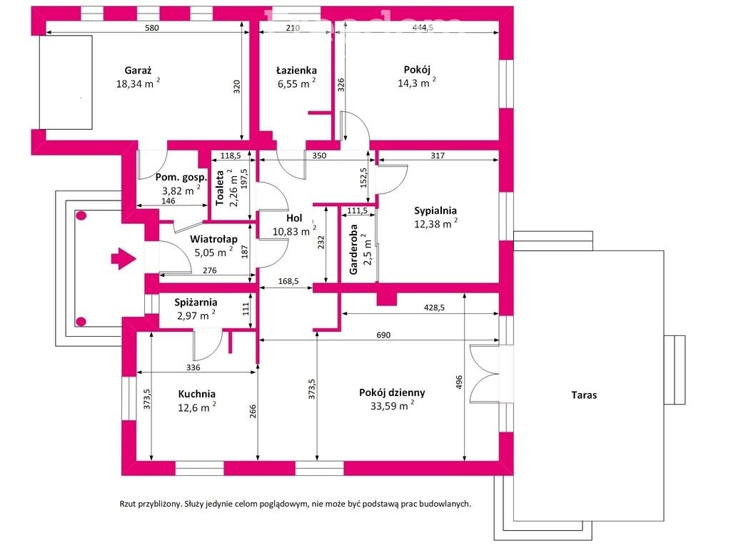 z garażem (18,34 m²), wiatrołap, pomieszczenie gospodarcze z